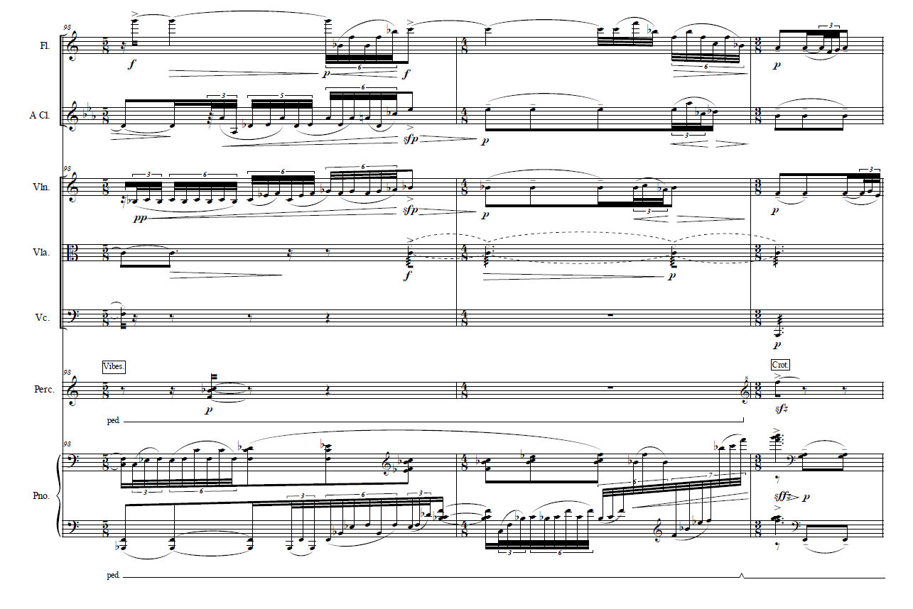 Scored for flute, clarinet in A, (doubling B-flat and E-flat), violin, viola, cello, percussion*, and piano, it clocks in at around 20 minutes and is one of the larger pieces I’ve written recently.